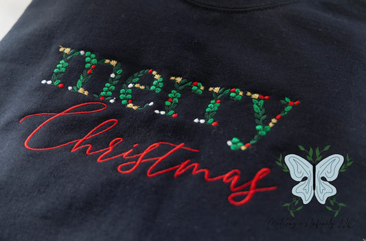 Merry Christmas Botanical Embroidered Black Crewneck Sweatshirt