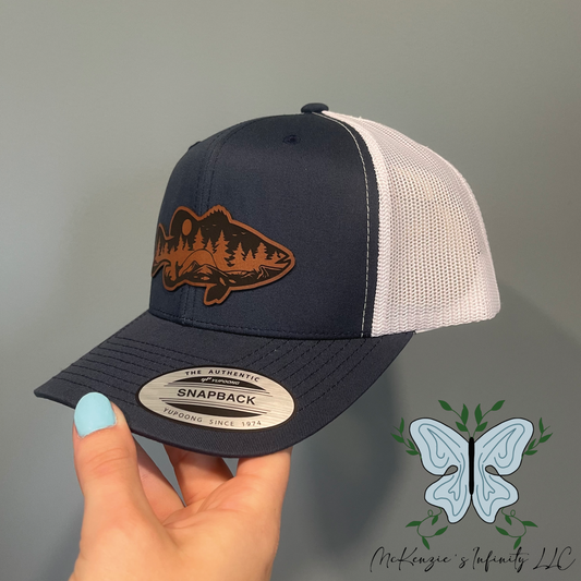 Bass Fish Mountain Leather Patch Adult Unisex Retro Trucker Hat/Cap