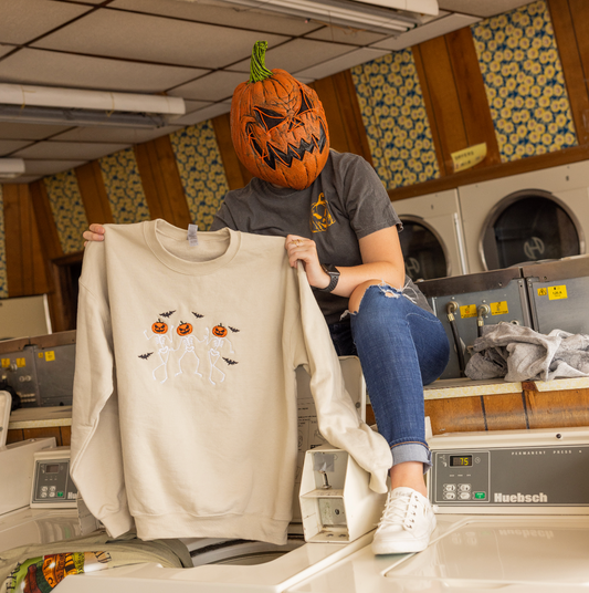 Spooky Pumpkin Head Dancing Skeletons Embroidered Crewneck