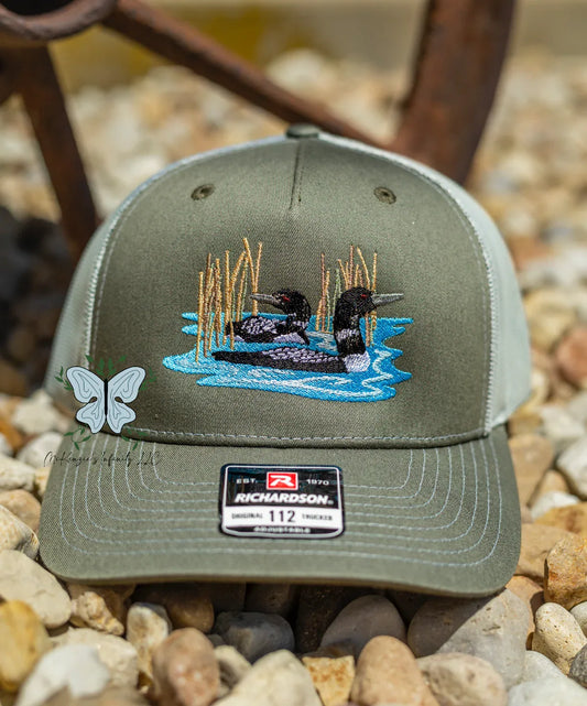 Two Loon Ducks In Reeds Embroidered Richardson 112 | 6 Panel Trucker Cap/Hat